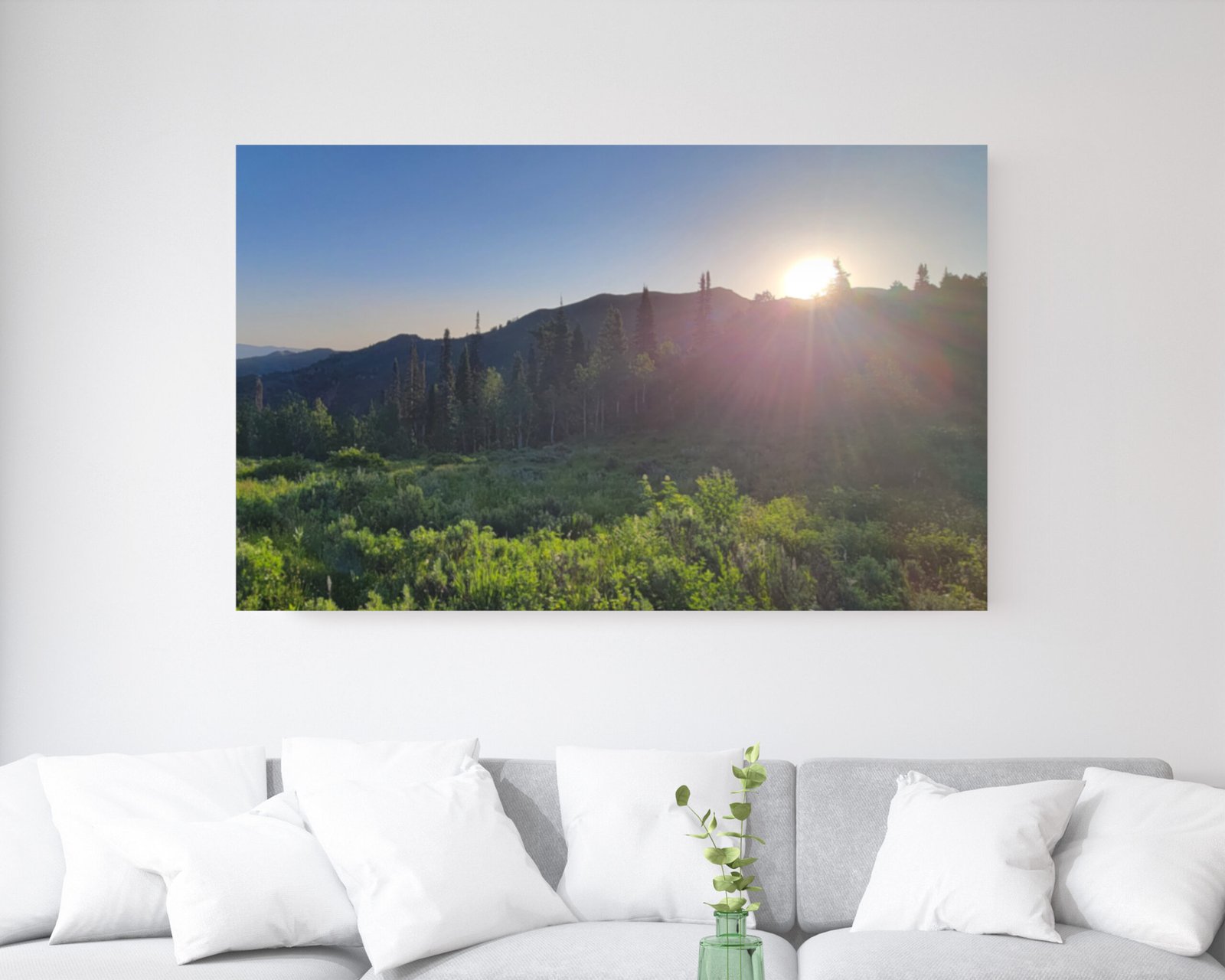 The wall art captures the first light cresting over a forested ridge, sending warm rays across lush green terrain. The contrast between the calm, neutral interior and the vibrant natural landscape creates a sense of quiet renewal—an invitation to pause, breathe, and let the beauty of the outdoors transform the space. This piece brings depth, warmth, and a touch of wonder to any room.